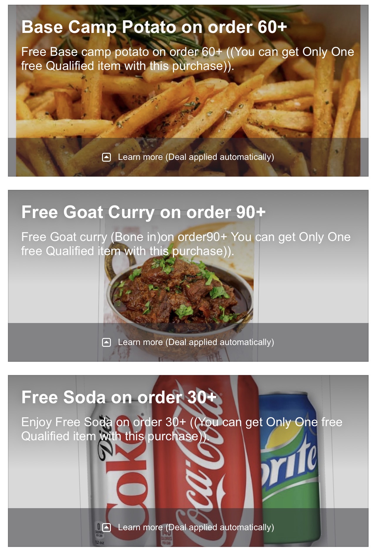 Unique platter for one, with your choice of meat or veg, Basmati rice served with fresh stir fried mustard leaves, tomato achar (pickle),vegetable curry, daal (lentils) Papadum, yogurt and mouth-watering desserts.